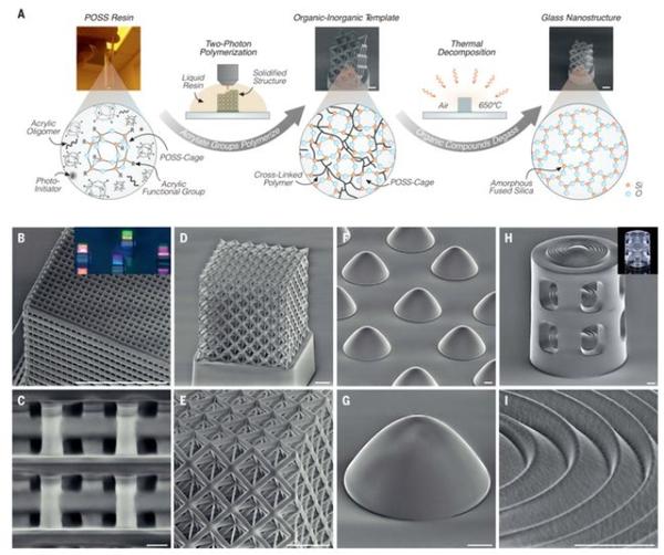 加利福尼亚州立大学J. Bauer团队提出了一种无需烧结,低温实现3D打印硅玻璃的技术,可以实现复杂的透明熔融石英玻璃纳米结构的制造。该技术主要采用丙烯酸酯功能化的多面体低聚硅氧烷(POSS)树脂进行自由形态熔融二氧化硅纳米结构的无烧结、双光子聚合,以实现纳米结构的打印。与传统通过牺牲性粘合剂不同,这种POSS树脂本身构成了一个连续的硅氧分子网络,仅在650℃时就能形成透明的熔融石英。这个温度比将离散的二氧化硅颗粒熔化成连续体的烧结温度低500°C。相关工作以“A sinterless, low-temperature route to 3D print nanoscale optical-grade glass”为题,于2023年6月1日发表在《Science》上。