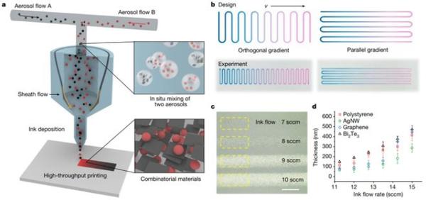 美国圣母大学张艳良教授团队报告了一种高通量的组合打印方法,能够以微观空间分辨率制造具有成分梯度的材料。在气溶胶阶段进行原位混合和打印,可以即时调整各种材料的混合比例,这是使用液-液或固-固阶段的原料进行传统多材料打印时无法实现的重要特征。作者展示了各种高通量的打印策略和在组合掺杂、功能分级和化学反应方面的应用,使掺杂硫族化物和具有梯度特性的成分分级材料的材料探索成为可能。将增材制造的自上而下的设计自由与自下而上的对局部材料成分的控制结合起来的能力,有望开发出传统制造方法所无法达到的成分复杂的材料。相关工作以“High-throughput printing of combinatorial materials from aerosols”为题,于2023年5月10日发表在《Nature》上。