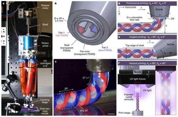 哈佛大学Jennifer A. Lewis团队设计了一种旋转的多材料3D打印平台,可以控制3D打印细丝实现异质螺旋亚三维结构。通过控制连续旋转多材料喷嘴角速度与平移速度比,可以在给定的圆柱体细丝中创建了具有可编程螺旋角度、层厚度和界面面积的螺旋丝亚三维结构。利用这种打印方法,在介电弹性体基体中嵌入了导电螺旋通道,实现了可灵活调控的功能性人造肌肉。相关工作以“Rotational multimaterial printing of filaments with subvoxel control”为题,于2023年1月18日发表在《Nature》上。